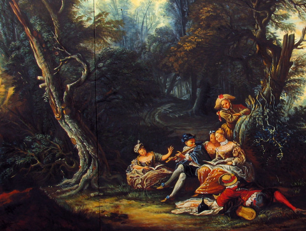 empty oom detail of the painted lid, Aline d'Ambricourt harpsichord empty