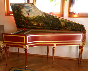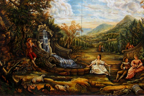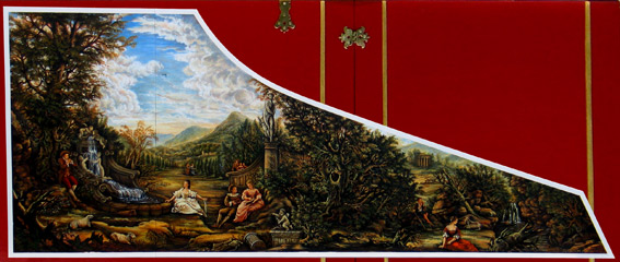 Couvercle peint à l'huile, paysage avec décor de genre galant.