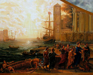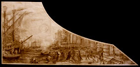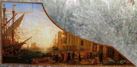 Clavicembalo dell’Università di Palermo. Strumento costruito dal cembalaro Ugo Casiglia. Il coperchio dipinto ad olio liberamente ispirato ad una marina di Claude Lorraine. Nella foto sotto il disegno preparatorio.