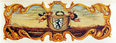 Rabat peinte à l'huile avec paysage encadré dans lequel deux anges campent qu'ils soutiennent un drap avec le blason d'Ingolstadt.